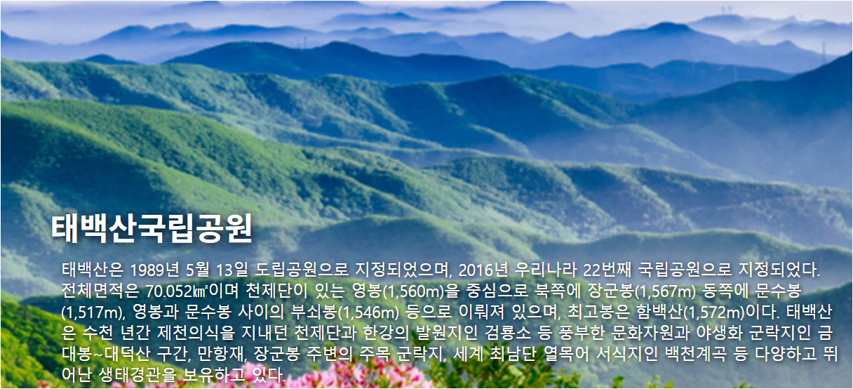 - 특징 : 능선길을 따라 태백산의 웅장한 풍광을 한눈에 담을 수 있어 인기가 높습니다.